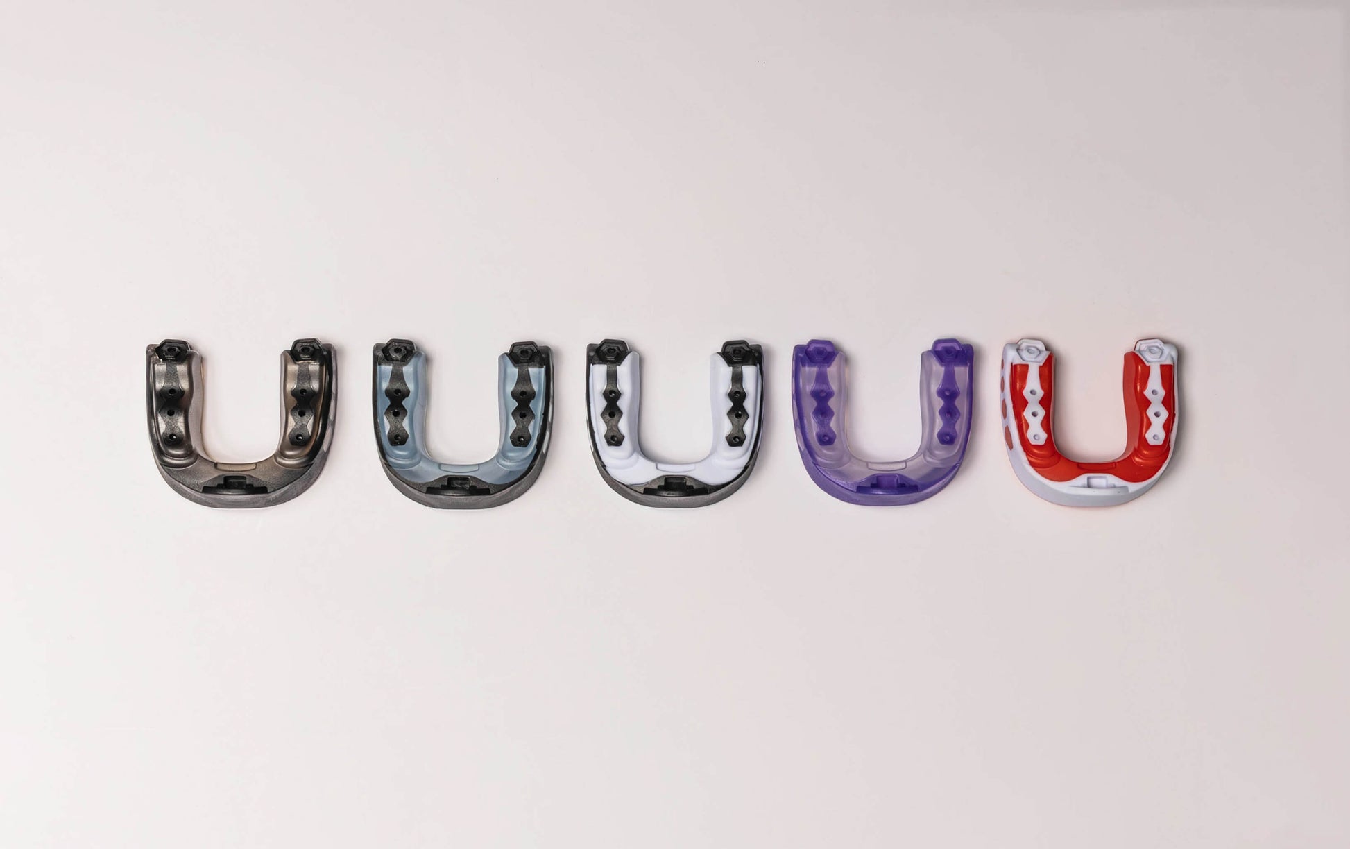 5-pack of assorted dual and tri-color deluxe mouth guards with case. Each mouth guard has it's own case.